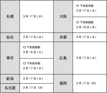 札幌、仙台、東京、新潟、名古屋、大阪、京都、広島、福岡のいずれかの日本通運支店